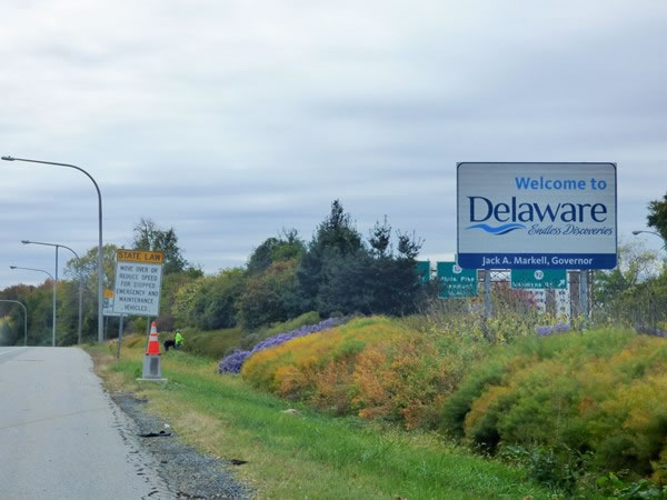 Entering Delaware on the I-95 US interstate highway. Jack Markell, the Governor of Delaware, was near the end of his two terms in office; a week after I took this photo, John Carney – another Democrat – was elected to succeed Markell. |