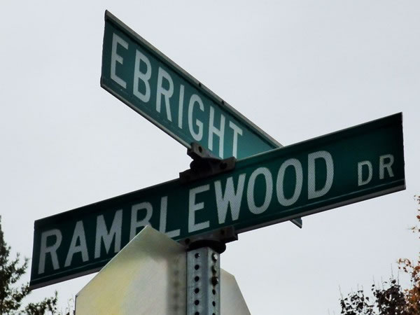 Six-tenths of a mile / one kilometre after turning onto Ebright Road, I turned right into Ramblewood Drive, and found …
