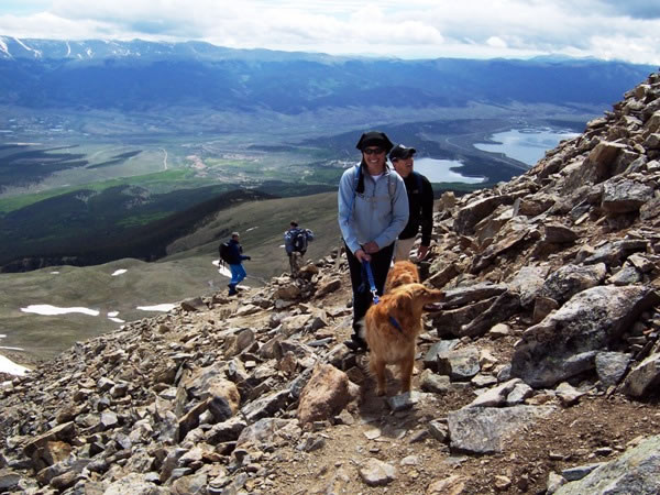 Less than half an hour after we left the summit, we met this couple and their two dogs heading for the top. That's how easy climbing Mt Elbert is – even dogs can do it! Note that the weather had improved (for a while at least). Twin Lakes are on the right of the picture. |