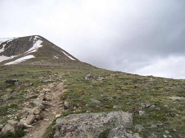 Back down on ground that's less steep, I looked back at the first of Mt Elbert's many false summits. Small clusters of wild flowers are visible in the foreground, and – given that we were descending the mountain – there was now ample time to stop and admire them. |