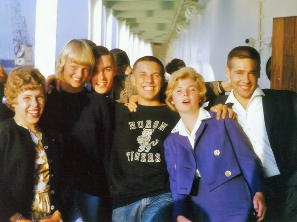Together with almost all the 1962-63 AFS students from Europe, I left Hoboken, New Jersey, in late July 1963 and crossed the Atlantic on the MS Seven Seas. The ship docked in Rotterdam and, before we disembarked, I took this photograph of some of the AFS students who, like me, had spent the 1962-63 academic year at high schools in north-east Ohio. From left to right are Rachel Pugsley (from England), Hille von Seggern (West Germany), Nick Wise (England), Alessandro Subissi (Italy), Margareta Ousback (Sweden), and Bernd Mueller (West Germany). |