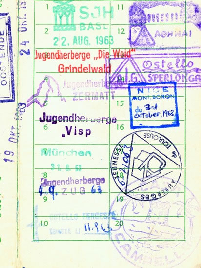 This is a photograph of the first page of my Youth Hostels Association (YHA) membership card. As can be seen from the stamps at the top of the left-hand column, the first three youth hostels I ever stayed in were the Basel, Grindelwald, and Zermatt jugendherberges. |