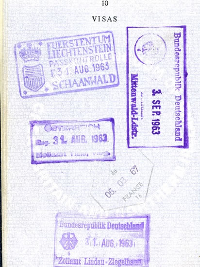 From top to bottom on the left-hand half of the page, this photograph shows the passkontrolle stamps for the Principality of Liechtenstein (Fuerstentum Liechtenstein), Austria (Österreich), and the Federal Republic of Germany (Bundesrepublik Deutschland) that were put into my passport on 31 August 1963. |