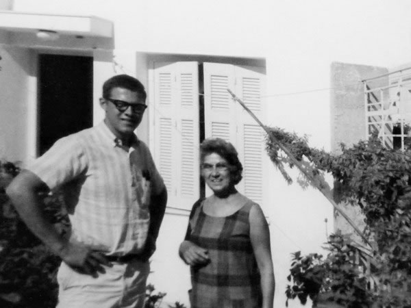 We went to Syros to visit Mr and Mrs Kontes, the parents of Eleni Camperos, Dave’s neighbour in Los Angeles. This photograph by Bill is of Dave and Eleni’s mother, Sofia Kontes, standing in the garden of her small white-washed home on the island of Syros. |