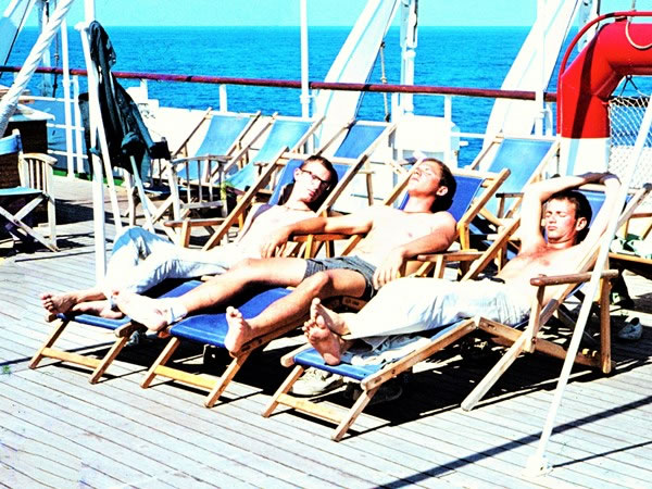 While we were on the ferry, as I wrote in my diary, we “sunbathed in glorious weather.” From left to right are Bill, Dave (still with a bandaged foot), and Gary. At 4:15 pm, we docked in Brindisi and were back in …