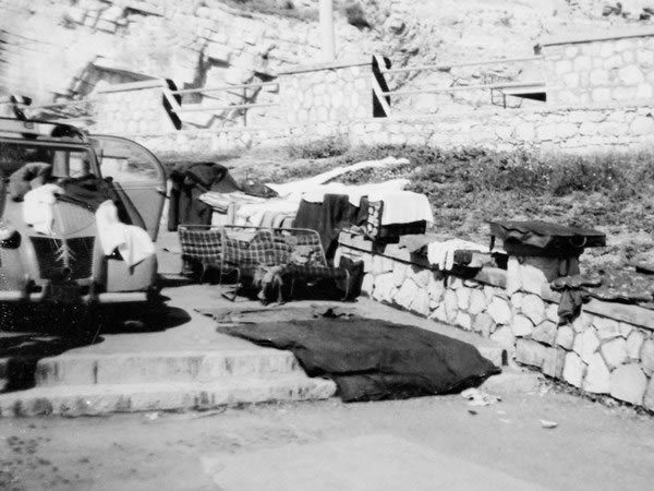 After leaving Pompeii, we drove north and spent the night in the Sperlonga youth hostel. The following morning, Thursday, 26 September, was lovely and sunny, so we stopped in Terracina and – as this photo by Bill shows – took everything, seats and all, out of the Citroën and laid them out in the sunshine to dry. |