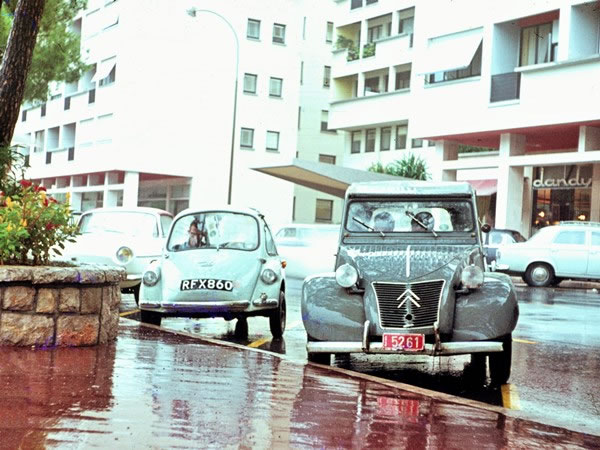 It rained all the time we were in Monaco. Inexplicably, the Monte Carlo casino refused us entry, but we did drive round the Grand Prix course stopping at one stage so I could take a hurried photograph of our cars in a new country.