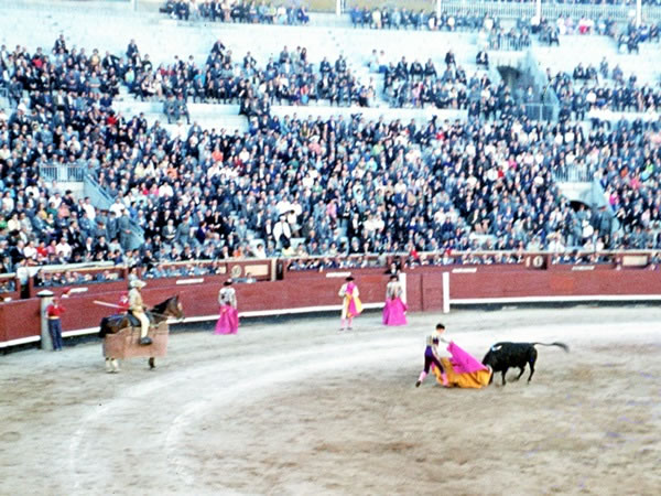 A picador on horseback and three peóns wait near the edge of the bull ring, while a matador near the centre of the ring entices a bull to make a series of passes.