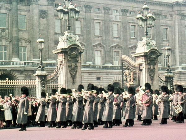 A Guards’ band (sadly, with the guards wearing their grey winter uniforms) marches past Buckingham Palace.