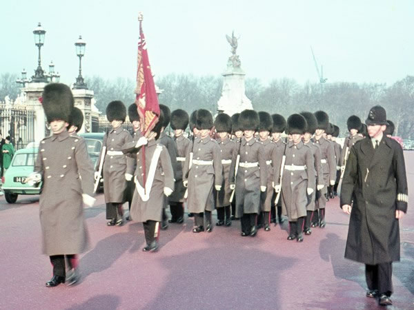 Scots Guards taking part in the changing of the guards ceremony at Buckingham Palace.