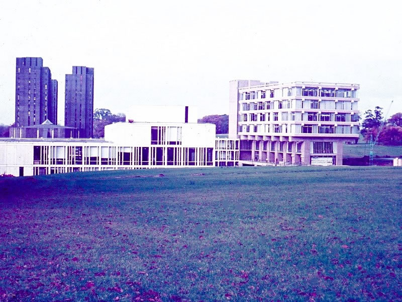 Introduction – UNITED KINGDOM: In July 1968, we moved from Farnham to Colchester so that I could become a postgraduate student in the Department of Government at the University of Essex. This is a photograph I took in 1969 of the university campus at Wivenhoe Park (which is roughly six kilometres / four miles east of Colchester). The building on the right-hand side of the picture is the university library, while the tall dark towers on the left were student accommodation blocks. |