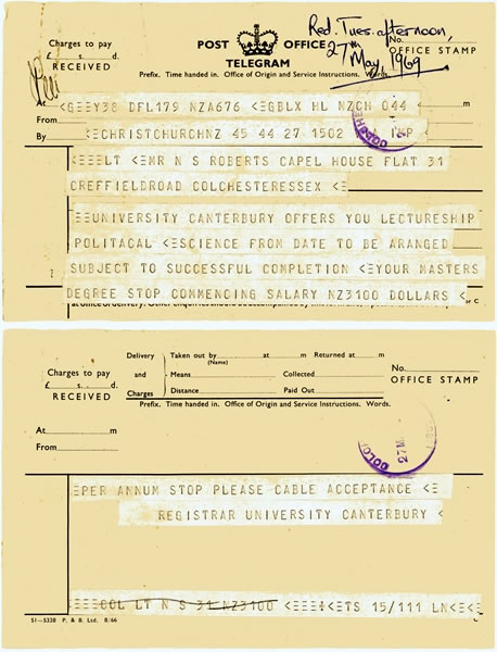 Introduction – UNITED KINGDOM: On 27 May 1969, I received a telegram offering me a lectureship in Political Science at the University of Canterbury in Christchurch, New Zealand (with a commencing salary of $3,100 per annum!). However, the offer was “subject to [the] successful completion” of my degree. This meant that after finishing my dissertation in September 1969, several months would go by before it was graded and I could formally take up the University of Canterbury’s offer. As a result, in subsequent correspondence with the University of Canterbury, it was agreed that I would start working at the university in January 1970. |