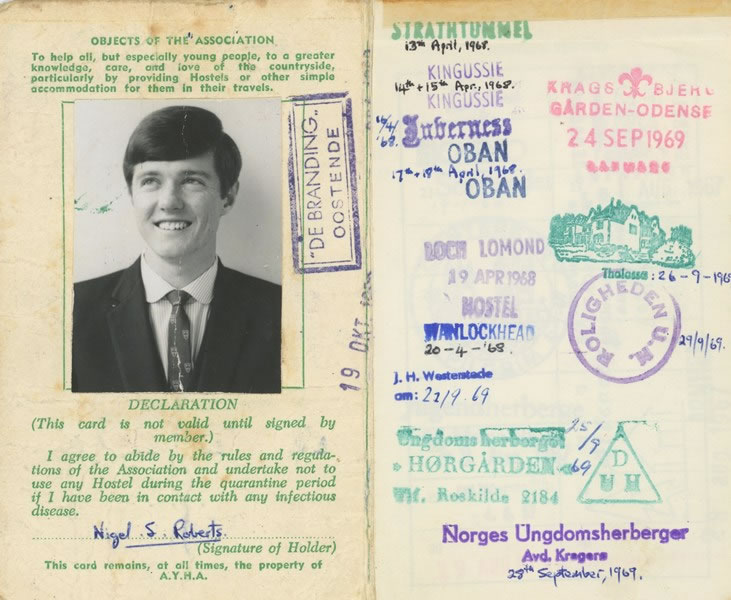 Days 8 to 12 (22 to 26 September 1969) – DENMARK: After staying in the Aabenraa and Middelfart campgrounds, the first Danish youth hostel that the three of us stayed in was in Odense, the largest city on the island of Funen. The hostel’s stamp is the red one at the top of the right-hand column of stamps on this page of my YHA membership card. |