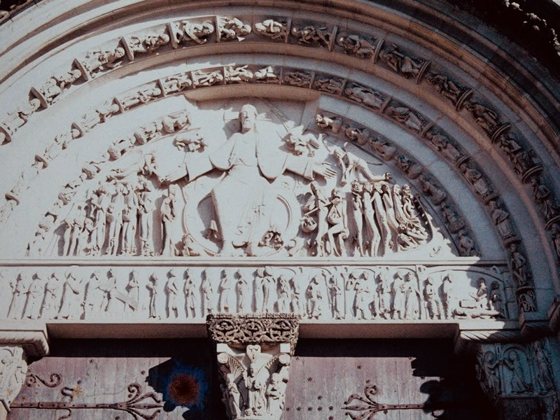 Day 48 (1 November 1969) VEZELAY: Intricate stone carvings above the entrance to the abbey. As UNESCO has said, With its sculpted capitals and portal, the Madeleine of Vezelay a 12th-century monastic church is a masterpiece of Burgundian Romanesque art and architecture. |