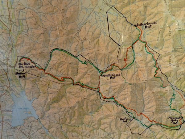 This map in Station Hut shows the farm’s boundaries in black, and the routes taken by High Country Track walkers (green) and mountain-bike riders (orange). On Saturday, 30 March 2013, we walked south-east via Halfway Hut to Pleasant Gully Hut. On Sunday, 31 March, we hiked north to Sutherland’s Hut. On Monday, 1 April, we walked south-west to Devil’s Creek Hut; and on Tuesday, 2 April, we completed the Four Peaks High Country Track by heading west, back to Station Hut. The four peaks that give the Station its name are Devil’s, Fiery, Tripps, and Waihi Peaks, but only the first two fall within the boundaries of the farm. (Tripps and Waihi Peaks are near the right-hand edge of the picture.) |
