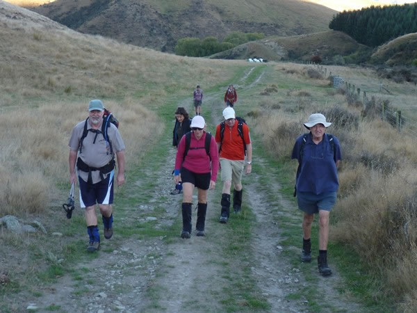 ... we started walking at 8:55 am. In addition to the Beagleholes and the Robertses, two couples from Auckland were also tramping the Four Peaks High Country Track. They’re in the centre of this picture, and – from left to right – are Chris Hart, Rosalie Stanley, Tracey Hartley, and Phillip Hartley. Tim’s on the right-hand edge of the photo, while Heather and Helen are bringing up the rear. |