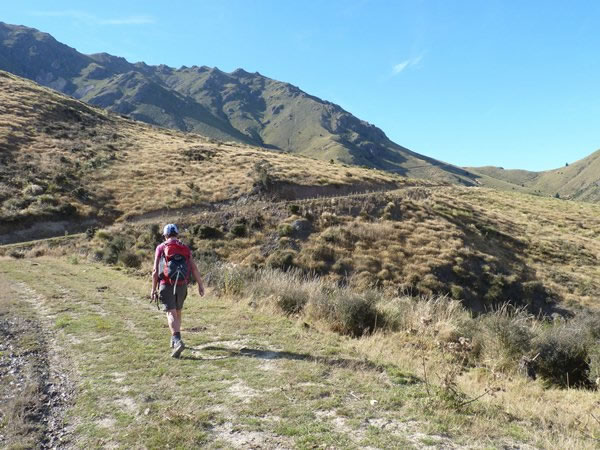 Heather heading up towards Doughboy Saddle after we’d been hiking for two-and-a-quarter hours. Note, incidentally, that we all carried only light day-packs: Jo McAtamney transported everyone’s heavy gear – sleeping bags, food, and the like – from hut to hut in her four-wheel drive SUV. |