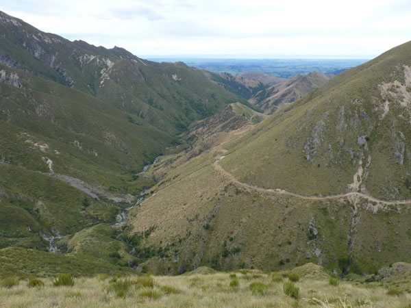 This photo was taken at 12:30 pm, after we’d crossed a tributary of the Hare River and begun climbing up the side of Fiery Peak. It’s looking east, out towards the Canterbury Plains …