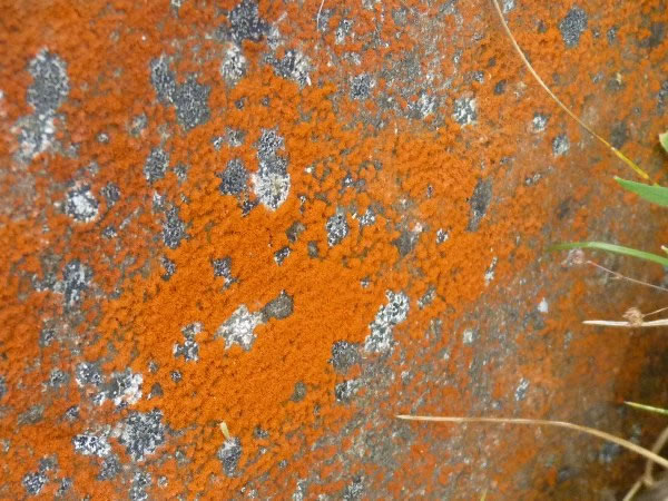 Orange lichen on a rock on the banks of a small stream that’s a tributary of the Hare River.
