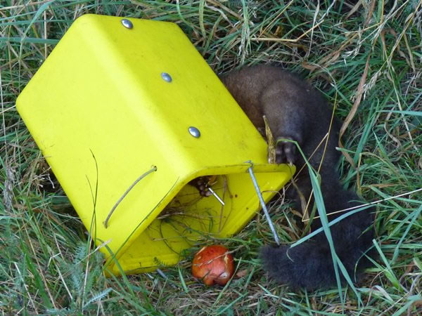 Flora and fauna: Possums are not native to New Zealand. They are a pest and a major problem. Four Peaks Station staff set possum traps near the huts, and this trap next to the Devil’s Creek Hut successfully enticed and killed a possum the night we were there. |