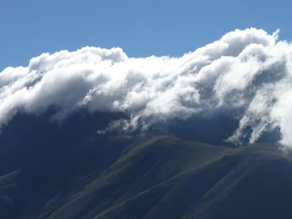 After we’d been walking for an hour-and-three-quarters, we stopped on the slopes below Jumpover Saddle for a drink and a snack. While doing so, I looked back, east, at the clouds covering Waihi Peak.