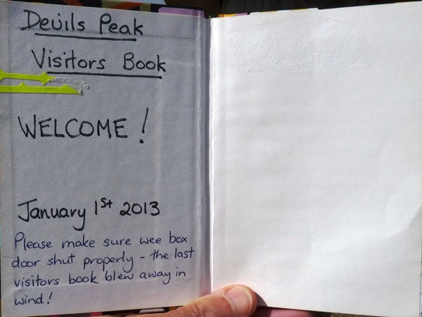 The wooden tramper with the raised left arm carried this visitors’ book – a summit register – under his right arm …