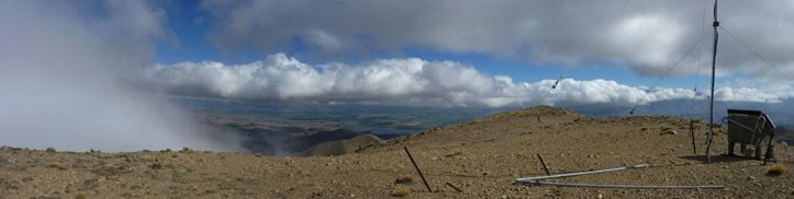 A three-shot panoramic picture from the summit of Devil’s Peak. Although cloud obscured the view south, the view west was reasonably clear and Lake Opuha can be seen in the middle of the picture (the left-slanting guy-wire pole points directly up at it). |