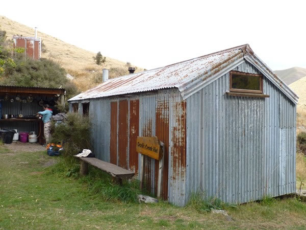 A photo of the Devil’s Creek Hut, and (on the left) the cooking shed and, above it, the toilet and shower cabin.
