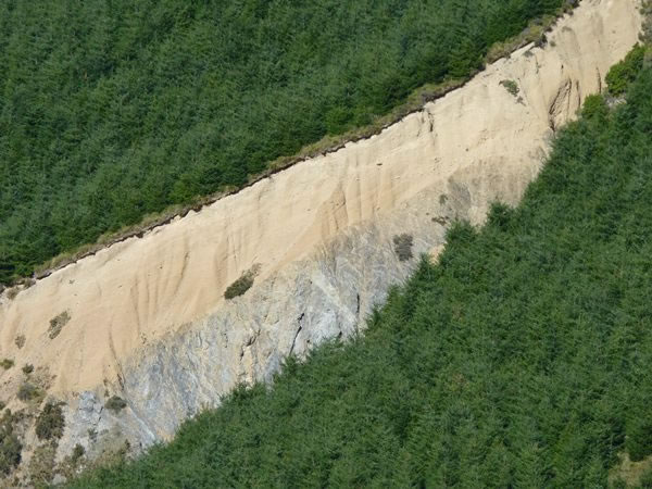 A deep ravine slashes through a dark green pine plantation.