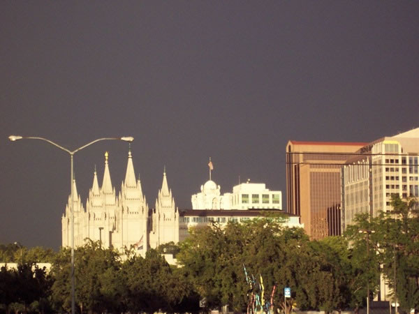 I flew into Salt Lake City on 11 July 2006. This is a photo of the Mormon temple (on the left) and downtown Salt Lake City buildings (on the right) just before a late-afternoon thunderstorm.