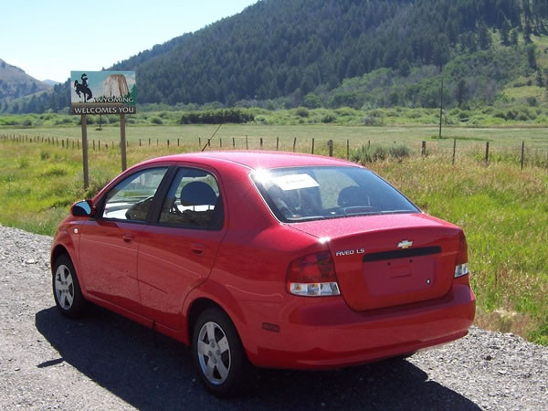 About to enter Wyoming on 13 July 2006. It’s interesting to note that Gannett Peak, the highest mountain in Wyoming, doesn’t feature on the state’s "Welcome to ..." sign; nor too does another extremely well-known Wyoming mountain – namely, Grand Teton. No, the most famous mountain in Wyoming (thanks at least in part to the film Close Encounters of the Third Kind) is Devil’s Tower. |