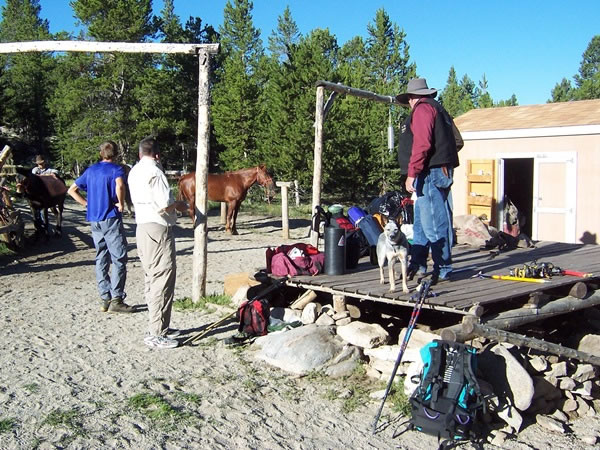 We gave a lot of our gear to an “outfitter”, who took all our heavy equipment, including my yellow-handled ice-axe and my crampons (which can be seen on the platform above my teal-blue pack in the lower right-hand corner of the picture), and – led by a wrangler – mules carried our gear roughly 13 miles / 21 kilometres to a spot near Island Lake, where we collected our equipment in the late afternoon and then carried it only a few hundred yards to the spot where we camped on our first night. |