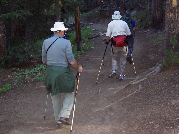We left the Elkhart Park trailhead at 8:20 am. This is a photo taken a short while after we started of Carl (nearest the camera), Rob (in the white shirt), and Mark (in blue) leading the way. Because our gear was being carried by mules for the first day, Carl, Rob, and Mark have all got either very light or even no packs. |