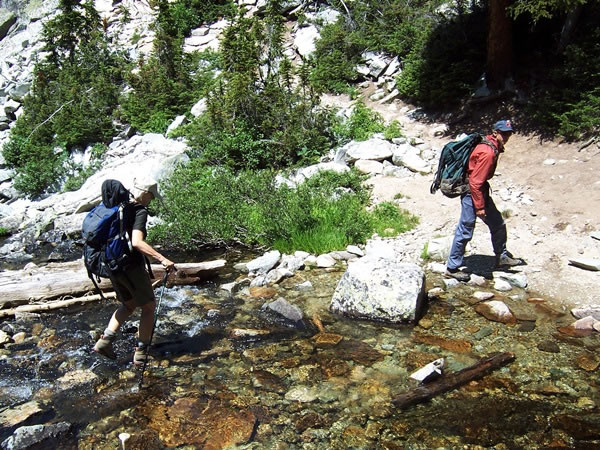 Squeek (left) and Mark crossing a small river a little more than four hours after we left the trailhead.