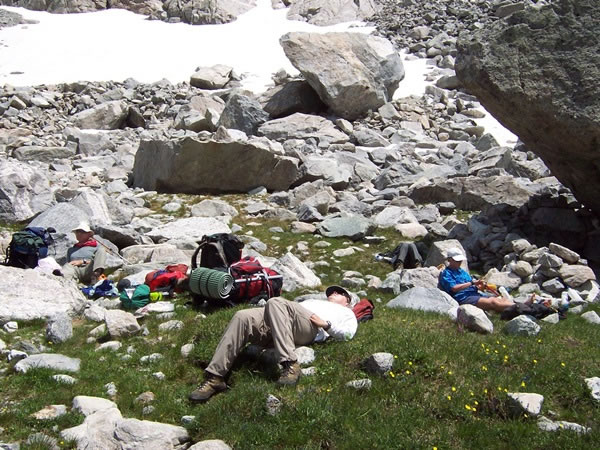 We stopped for lunch at 12:40 pm (after only just over three hours’ hiking) and decided we’d keep to a five-night / six-day schedule, which meant that we didn’t have to go any further. As a result, after lunch we relaxed and snoozed. From left to right: Carl (thoroughly camouflaged amid the rocks), Rob, Squeek (whose knees are just visible), and Mark. |