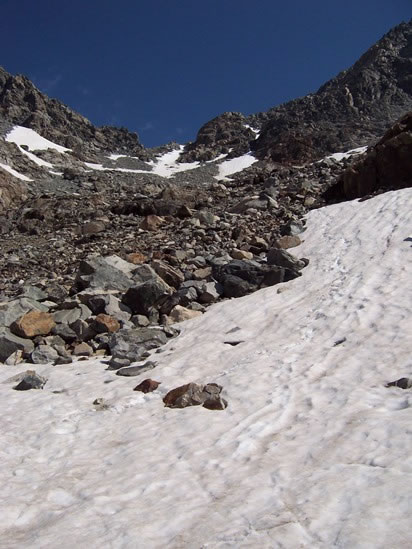 We had to climb up this snowfield (following the tracks made by people who’d been up it before us) and then bear left across rocks and talus in order to reach the next snowfield.