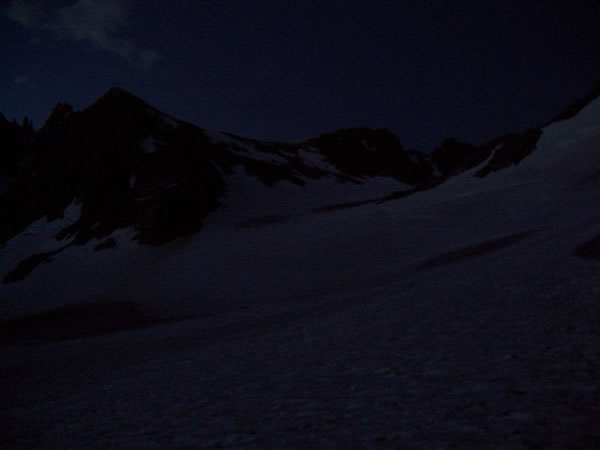At 5:20 am there was just enough light to take this photograph looking south, back across the Dinwoody Glacier towards Bonney Pass. The mixed snow and scree slopes that we descended in order to reach the glacier can be seen in the middle of the picture. |