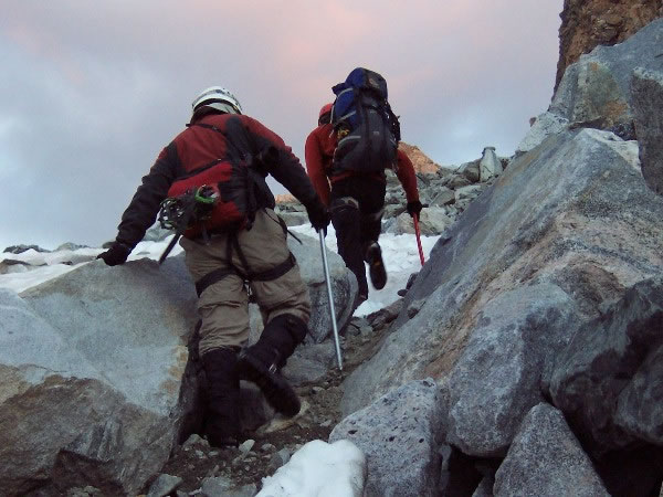 More mixed terrain: Mark and Rob making their way up to the northern flanks of the Dinwoody Glacier at about ten to six in the morning.