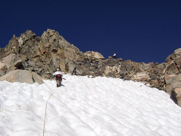 A photo of Rob nearing the top of the Gooseneck Glacier while Mark, standing on rocks on Gooseneck Ridge, belays him.