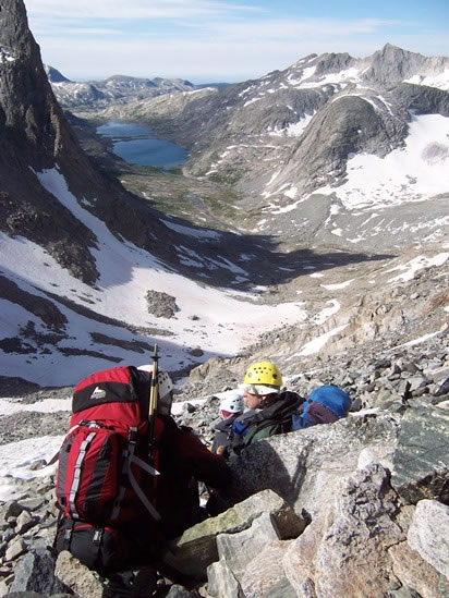 Going down the southern side of Bonney Pass was more difficult than climbing up it. Here we are resting only about a quarter of the way down.