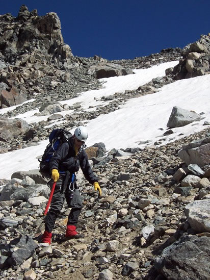 This photo of Squeek heading down the pass shows why it was difficult. Loose stones constantly slipped out from underneath one’s feet and started small avalanches. We had to be very careful both not to fall and not to bowl people over.