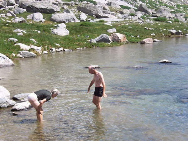 At 3:00 pm we stopped at the edge of a small lake sandwiched between the two large Upper and Lower Titcomb Lakes, and we all had a quick – and very cold but refreshing – swim.