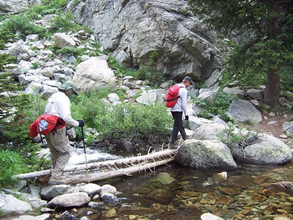 Rob (left, wearing a mosquito-net hood) and Mark crossing a river with the help of a pine-branch bridge.