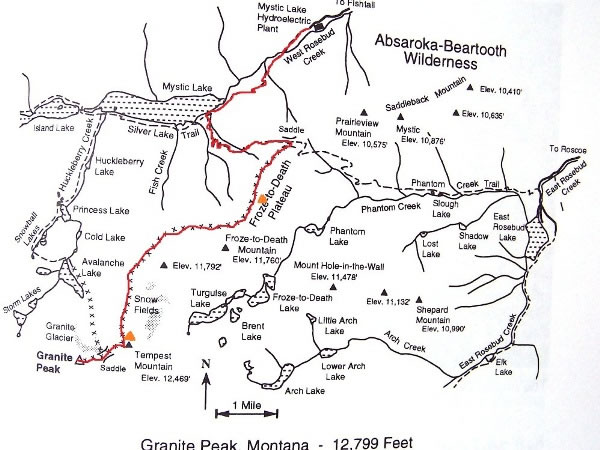 I’ve marked the route we took to climb Granite Peak in red on this photograph of a map that’s contained in Don Holmes’ book,