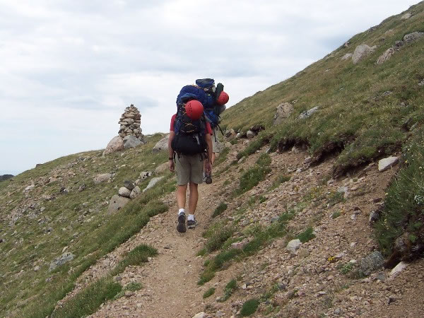 At 1:35 pm – four hours after we set out from the trailhead – we reached the cairn marking the spot where hikers heading towards Granite Peak leave the trail and turn right to head south-west across Froze-to-Death Plateau. Scott had stopped and waited for us, and in this picture is nearest the camera. |