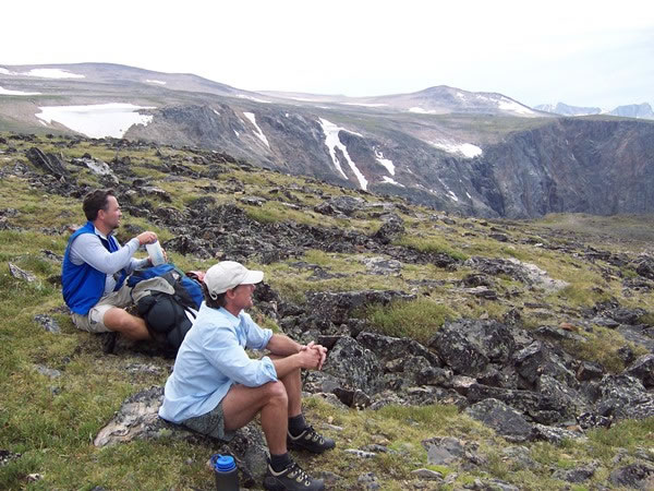 Jeff (left) and Marc pause for a drink during our hike across Froze-to-Death Plateau.