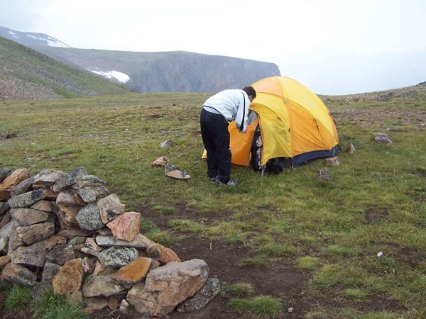 At 3:15 pm we reached a spot about 10,700 feet / 3,261 metres above sea-level on Froze-to-Death Plateau where we pitched our tents. In a little less than six hours, we’d carried heavy packs about six miles or ten kilometres and climbed more than 4,000 feet / 1,219 metres; we were ready to stop. Jeff, Scott, and I shared one tent (which Jeff is zipping up in this photo). |