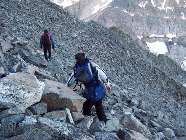 As had been the case on Gannett Peak, Wyoming’s high point, summit day on Granite Peak started with a descent. In this photo, Marc (left) and Jeff weave their way through a formidable field of boulders, heading down towards the saddle separating Tempest Mountain (on the left) and Granite Peak (on the right). |