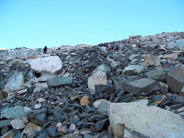 We then began climbing the horrendous talus fields – the jumbled mass of boulders – that gird the south-western flanks of Granite Peak. Jeff is on the left and Scott’s in the middle of the photo.