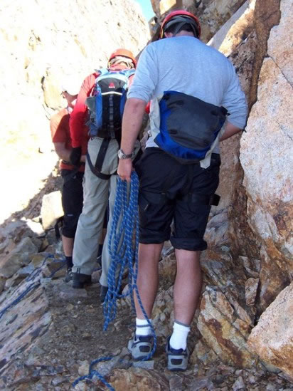 ... so we stopped to rope up. Marc’s in the front (on the left and partially obscured by the bright sunlight) ensuring that Scott is correctly tied onto the rope, while Jeff waits with coils of rope in his left hand.